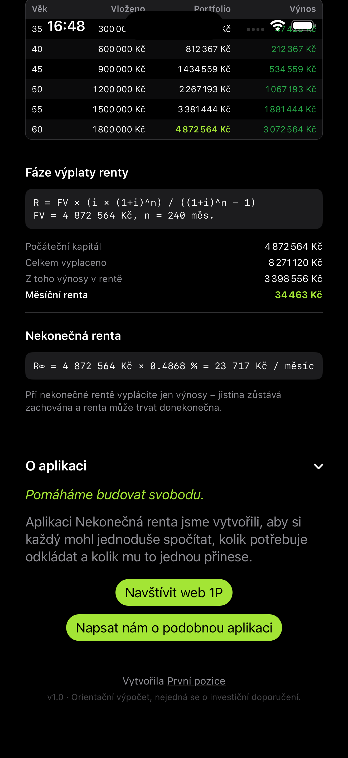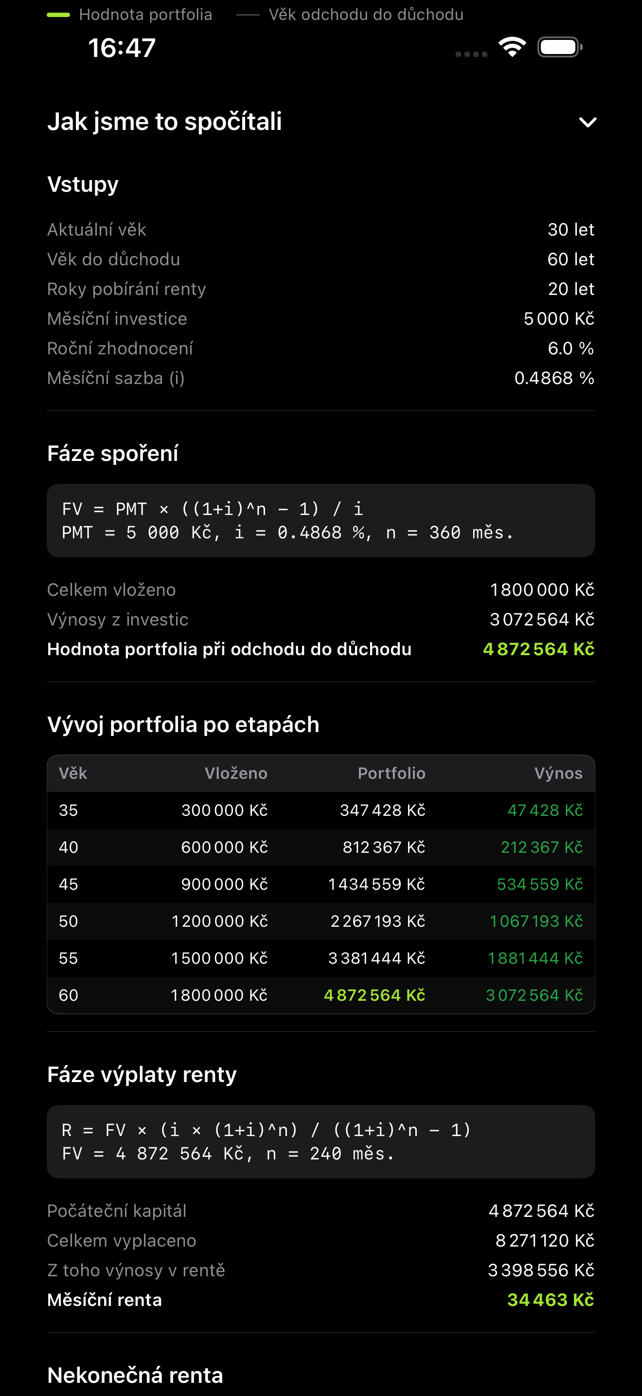 Nekonečná renta je jednoduchá iOS kalkulačka finanční nezávislosti. Během chvíle spočítá, jaký kapitál můžete vytvořit pravidelným investováním a jakou měsíční rentu si z něj lze vyplácet — na zvolený počet let i teoreticky donekonečna.